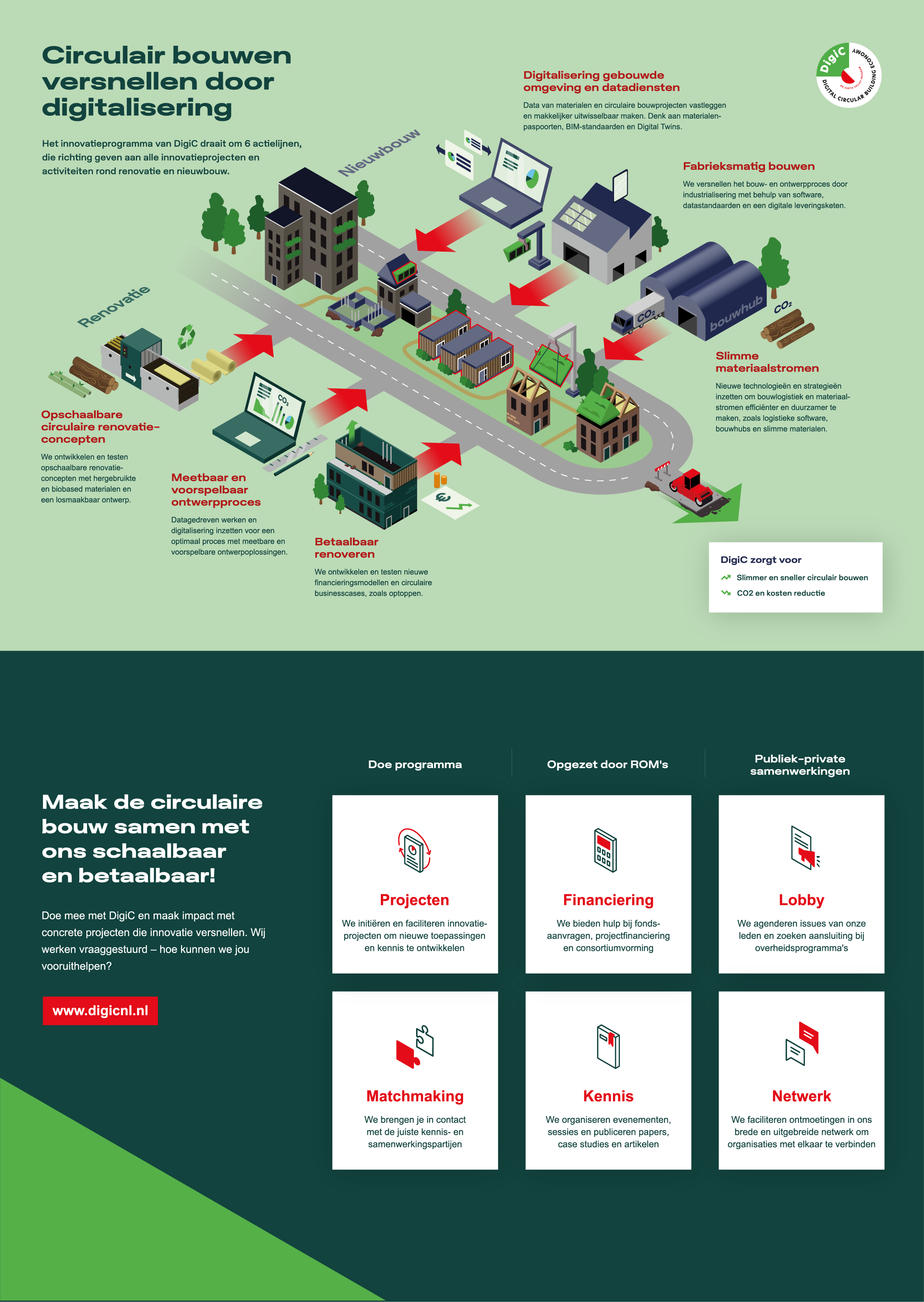 DigiC versnelt circulair bouwen in Nederland door het stimuleren van digitalisering. Circulair bouwen heeft de toekomst. Met deze manier van bouwen hebben we minder grondstoffen en hulpmiddelen nodig en wordt het milieu en klimaat minder belast. Digitalisering biedt hiervoor veel kansen. DigiC is een innovatieprogramma van bedrijven en overheden die deze kansen zien en hun krachten willen bundelen. Samen streven we naar digitale doorbraken die de circulaire bouw in Nederland schaalbaar en betaalbaar maken.