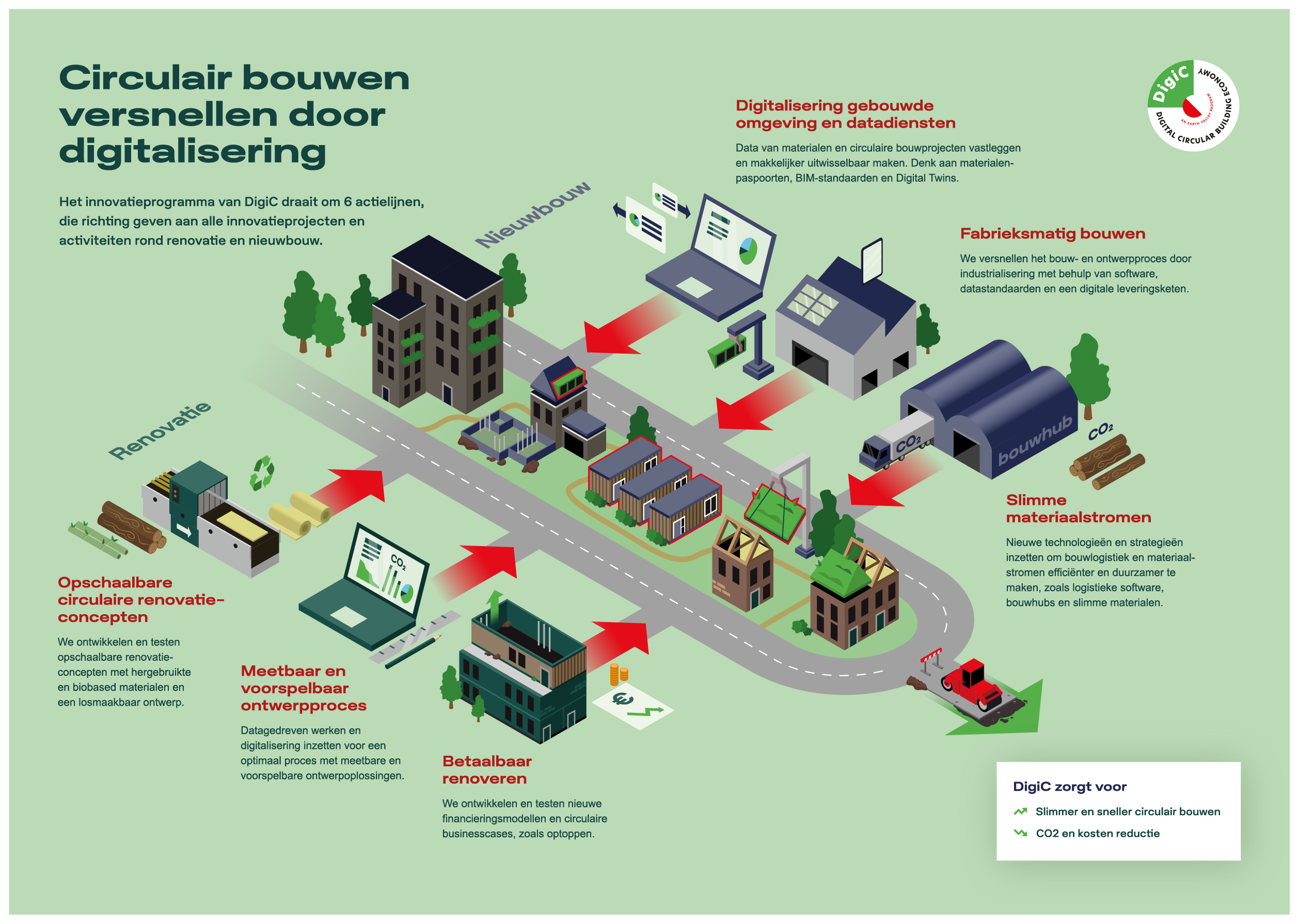In samenwerking met adviesbureau Route Circulair en een aantal marktpartijen heeft de ROM in 2021 de ‘Roadmap Digitalisering van de Circulaire Bouweconomie’ opgesteld. In deze Roadmap staan zes actielijnen centraal: fabrieksmatig modulair bouwen, digitalisering van materialen en slimme bouwlogistiek, opschaalbare circulaire renovatieconcepten, meetbaar en voorspelbaar ontwerpproces, betaalbaar renoveren . De activiteiten van DigiC volgen deze actielijnen.